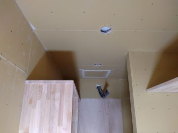 壁が貼り終わったのでコンセントやスイッチ、ダウンライトや換気扇などの穴開けです。