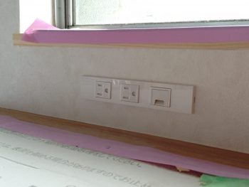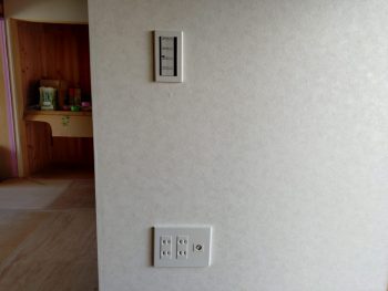 壁紙が貼られ、スイッチコンセントをつけて完成間近です
